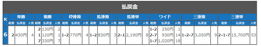 2番人気馬が絡んだものの4番人気⑧コスモデイナー、7番人気⑦カイコウが馬券内に入り3連複「98.2倍」と美味しい配当に。