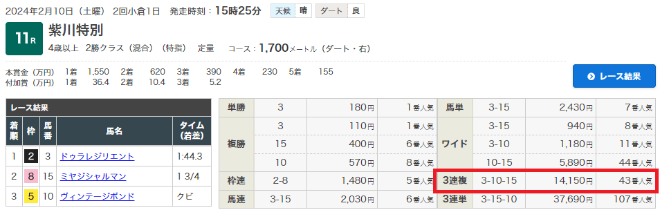 翌日の11日(日)G2京都記念では「45万5040円」獲得大成功!