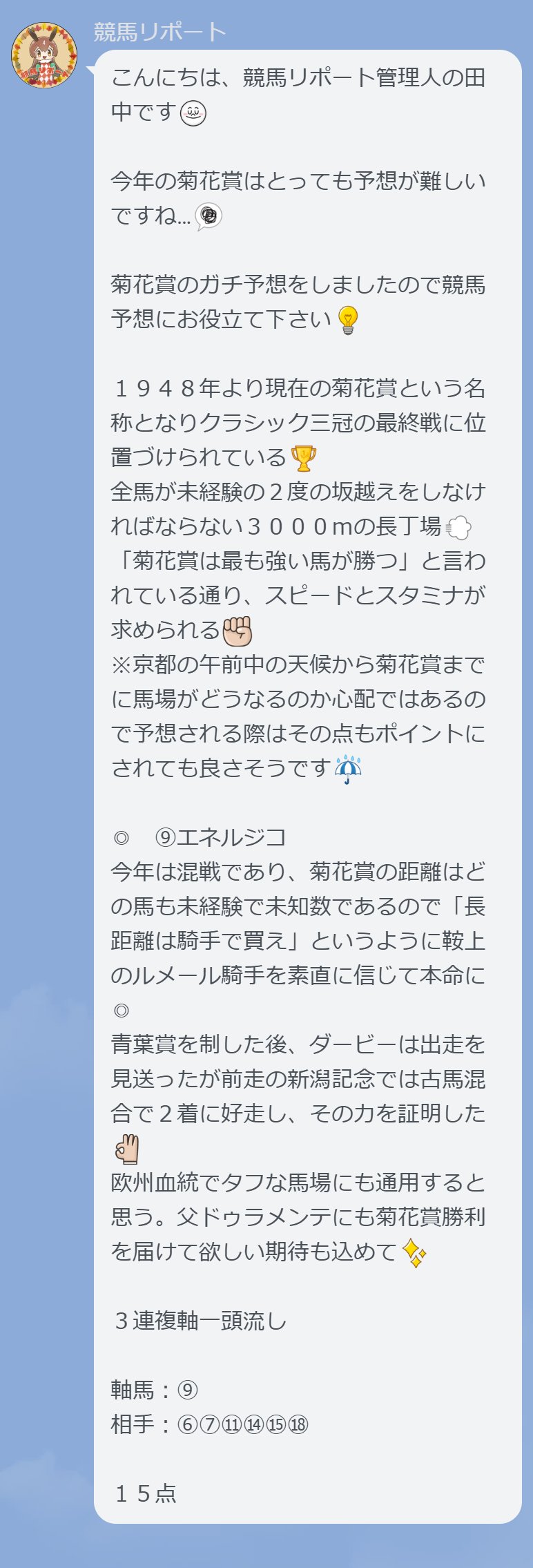 実績馬が集う天皇賞という事もあり配当は先週の菊花賞以上という事はできませんでしたがしっかりと的中をお届けできました。