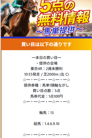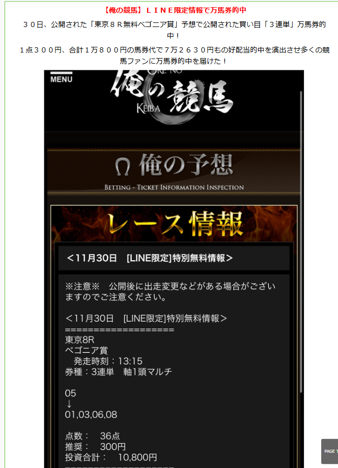 俺の競馬ってサイトは知っていたけど、俺の競馬内にLINE限定無料情報があったのは知らなかった… 昨日の月曜コンテンツの下の部分に紹介されててさっそくLINEも登録したわ。 先週7万損した気分だわ…