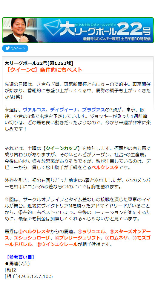 佐々木今週も当てたな、馬連7-2。最近好調じゃん。
