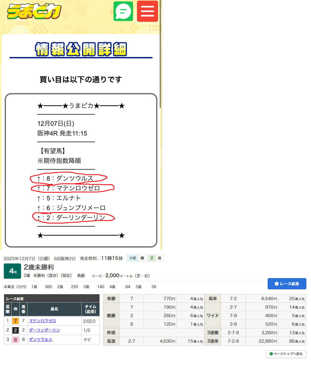 無料予想初利用だったので1点500円(合計9,000円の軍資金で11万4450円の払い戻しでした。