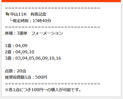 おそらく初回しか適応されない『スタートダッシュプラン』想定配当30~50万円、通常価格→7万円が9,800円。 安いし負けてもいいや感覚でやったらスタートダッシュどころか上半期分の収支をたった1レースで稼がせてもらいました。 フェアリーステークス15-4-1的中で、結果は公式乗ってるので引用はしませんが払い戻しは1点200円で賭けていたので175万8160円払い戻し、想定配当×3倍以上!